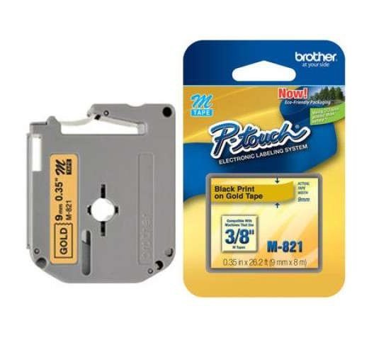 Brother M821 Black On Gold P-touch Label Maker Tape, 3/8 In. X 26.2 Ft. This non-laminated tape comes with standard strength adhesive and is recommended for home and indoor use only. Best suited for flat dry surfaces. Perfect for school projects, file folders, and other basic labelling needs.